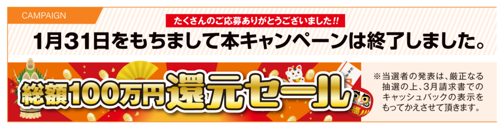 1月31日をもちまして「総額100万還元セール」は終了しました。たくさんのご応募ありがとうございました!!