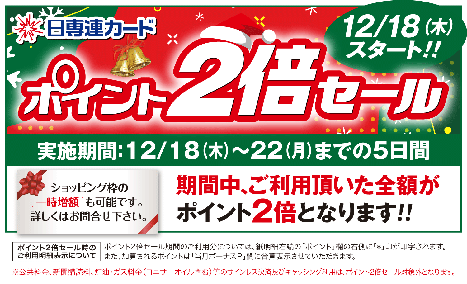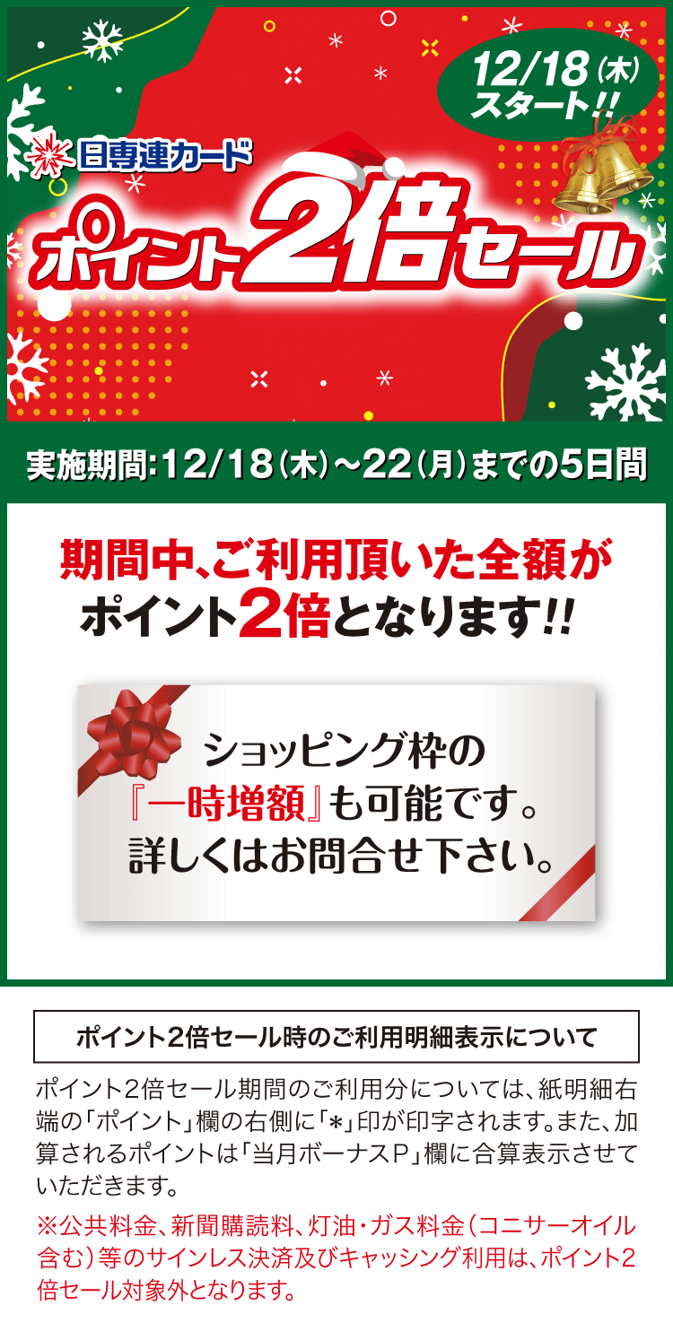 期間中、ご利用頂いた全額がポイント2倍となります!!ショッピング枠の一時増額も可能です。下記よりお申込みください。