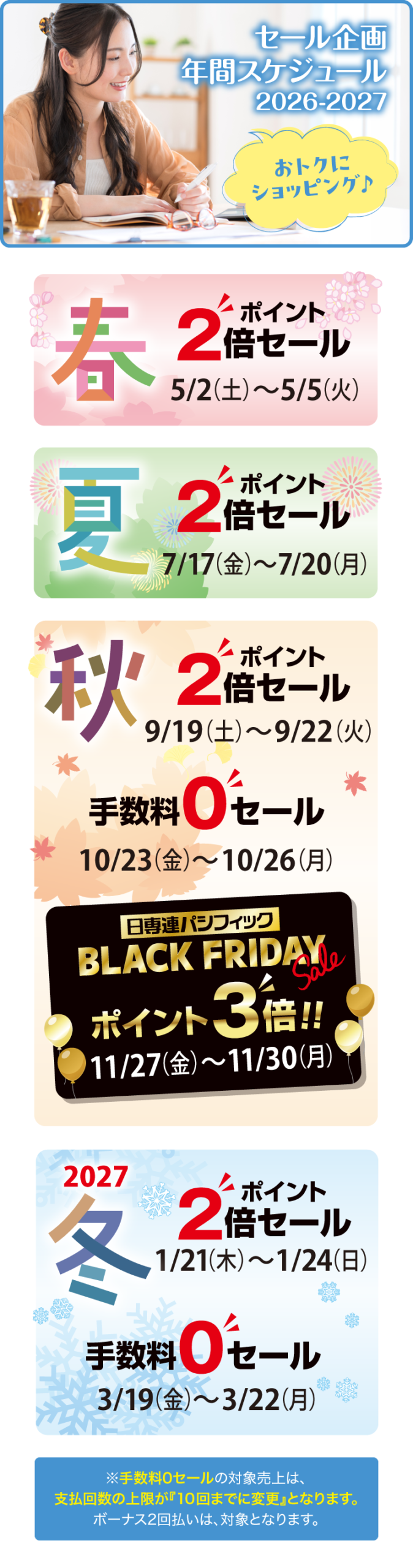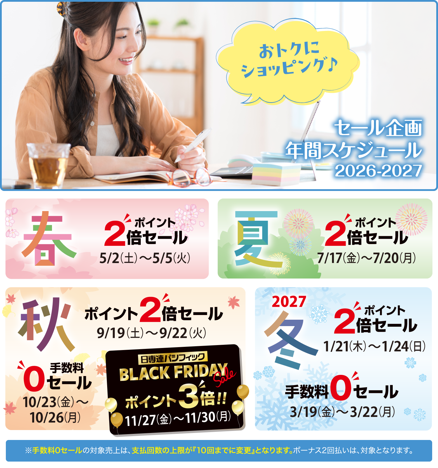 日専連パシフィックの「手数料0セール」「ポイント2倍セール」でお得にショッピング♪年間スケジュールを是非ご確認下さい!